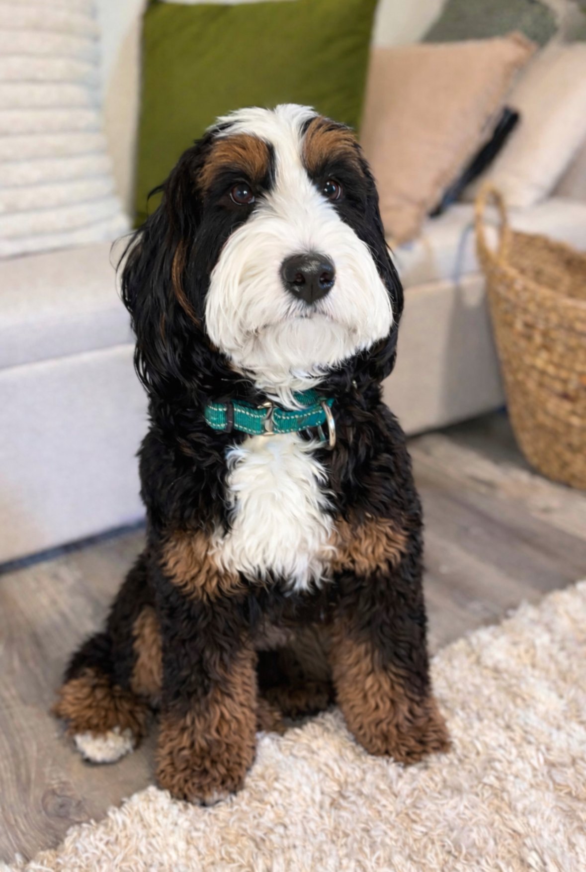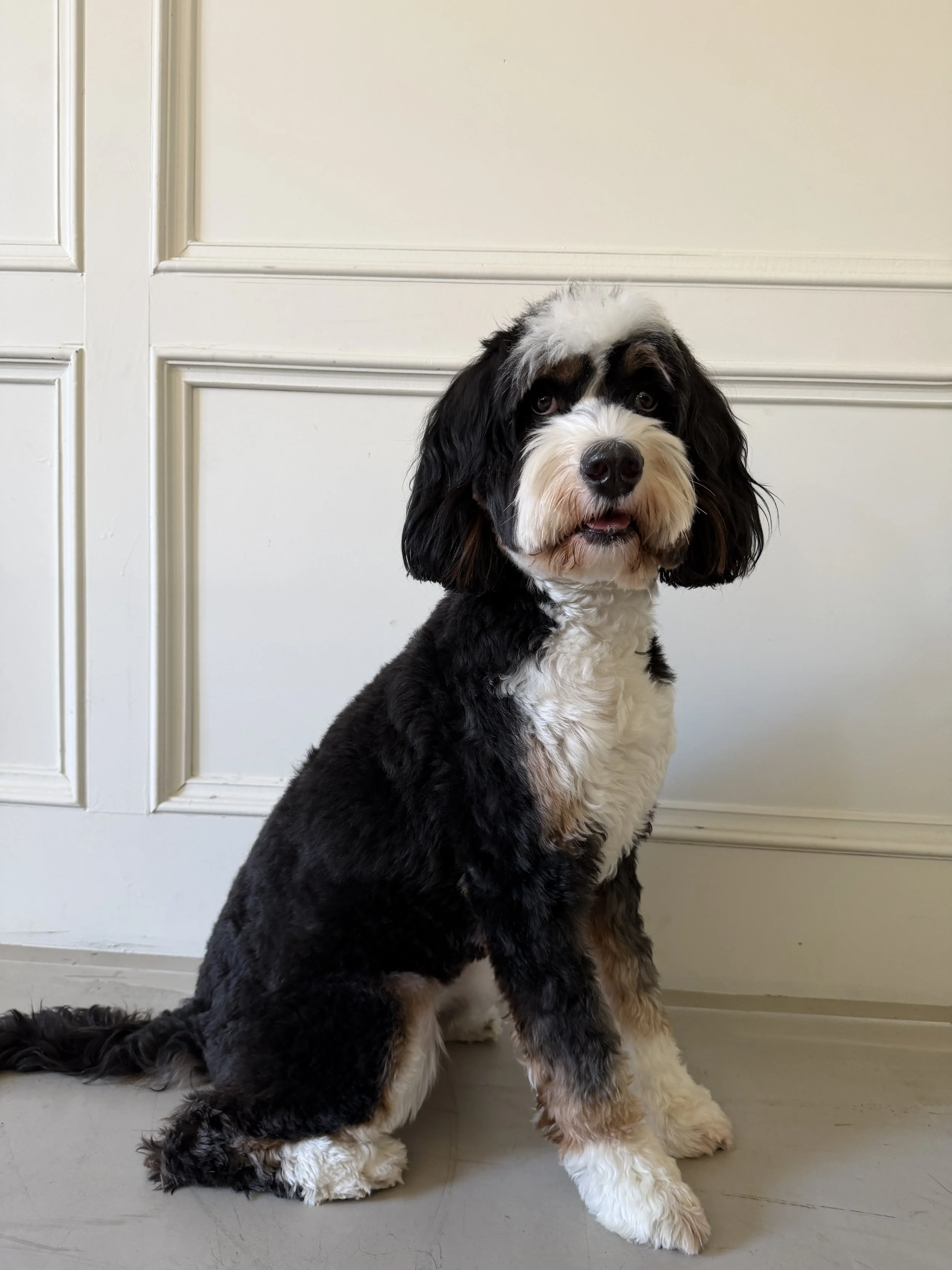 Penny is a beautiful ultra tricolor merle multigenerational bernedoodle living in the Katy, Texas area with her parents and two human sisters. She loves meeting new people, making friends with other dogs, and most of all snuggling with her incredible mom!
