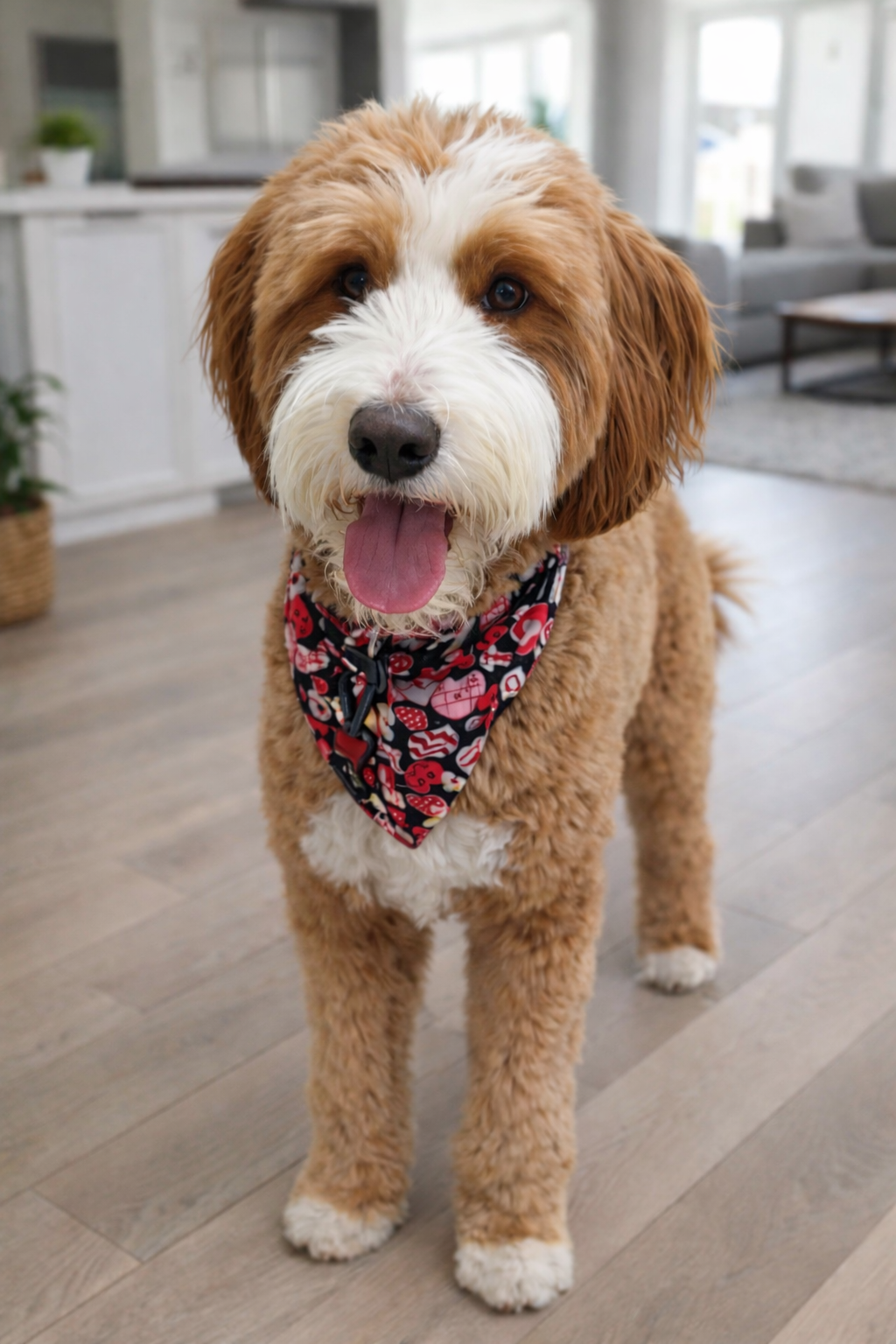 Millie lives in Kingwood with her family where she loves walks with her mom and when visitors come to see her. She is the cutest girl you’ve ever seen in a raincoat and has never met a stranger. She is a mini-medium multigenerational bernedoodle.